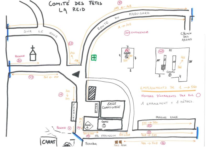En raison des travaux sur la Nationale 62, la situation des emplacements de la brocante a été radicalement modifiée, selon le tracé que vous voyez ci-dessous :